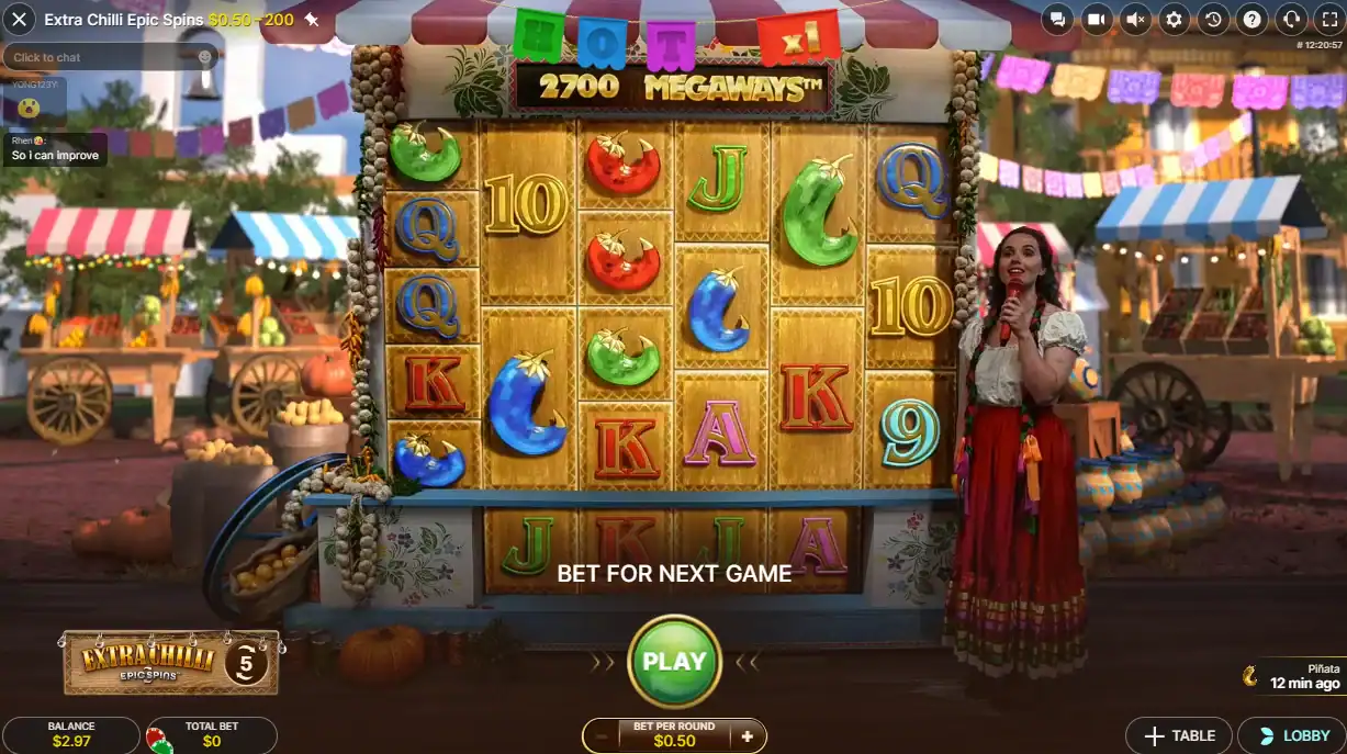 Extra Chilli Epic Spins is a community-style live game built by Evolution around the Extra Chilli concept, so it mixes slot mechanics with presenter-led entertainment. Unlike a regular slot, the whole room plays the same sequence of spins, while the host reveals crates, smashes Piñatas, and runs the bonus wheels on camera.